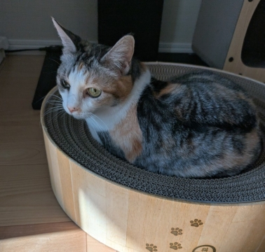 爪とぎボウルの中身を裏返してきれいな面をだしたら、すぐ気づいてのっているゆうひ。よく見ている頭のよい...