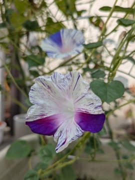 しぼり模様の朝顔7年前の種から育てたら、白い花が多くなりました。それでもきれいです9月になってから多...