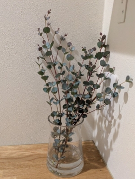 クリスマスの飾りを片づけて一枝のユーカリ(グニユーカリ)を小中大と3つに分けて飾りました猫たちの来な...