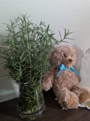 自宅のローズマリーを切って、花瓶に入れました。玄関にフレッシュのローズマリー♪いい香りに包まれています。お仕事で取り扱っている精油にもローズマリーがあって、そちらのほうが純度の高い香りがします。質の高い精油だからこそです。