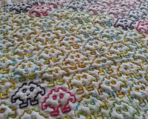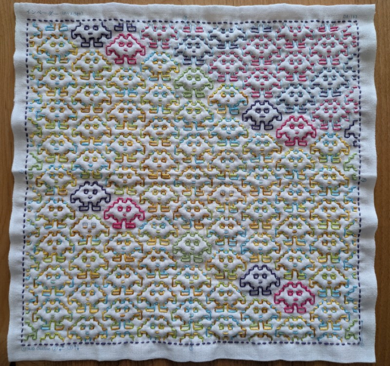 インベーダーのお顔はいろいろアレンジ、糸の色も遊んでみました。