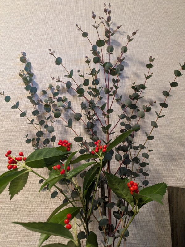 一枝のユーカリ(グニユーカリ)を小中大と3つに分けて飾りました